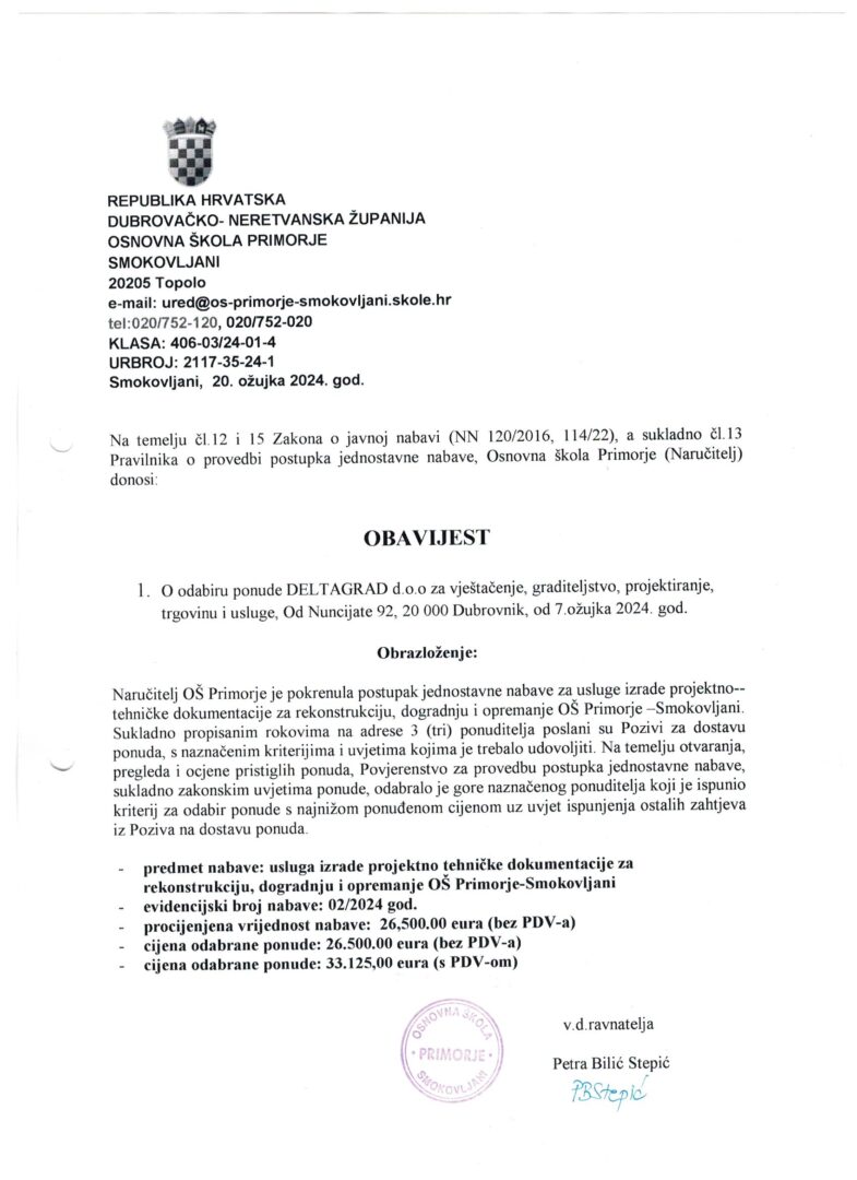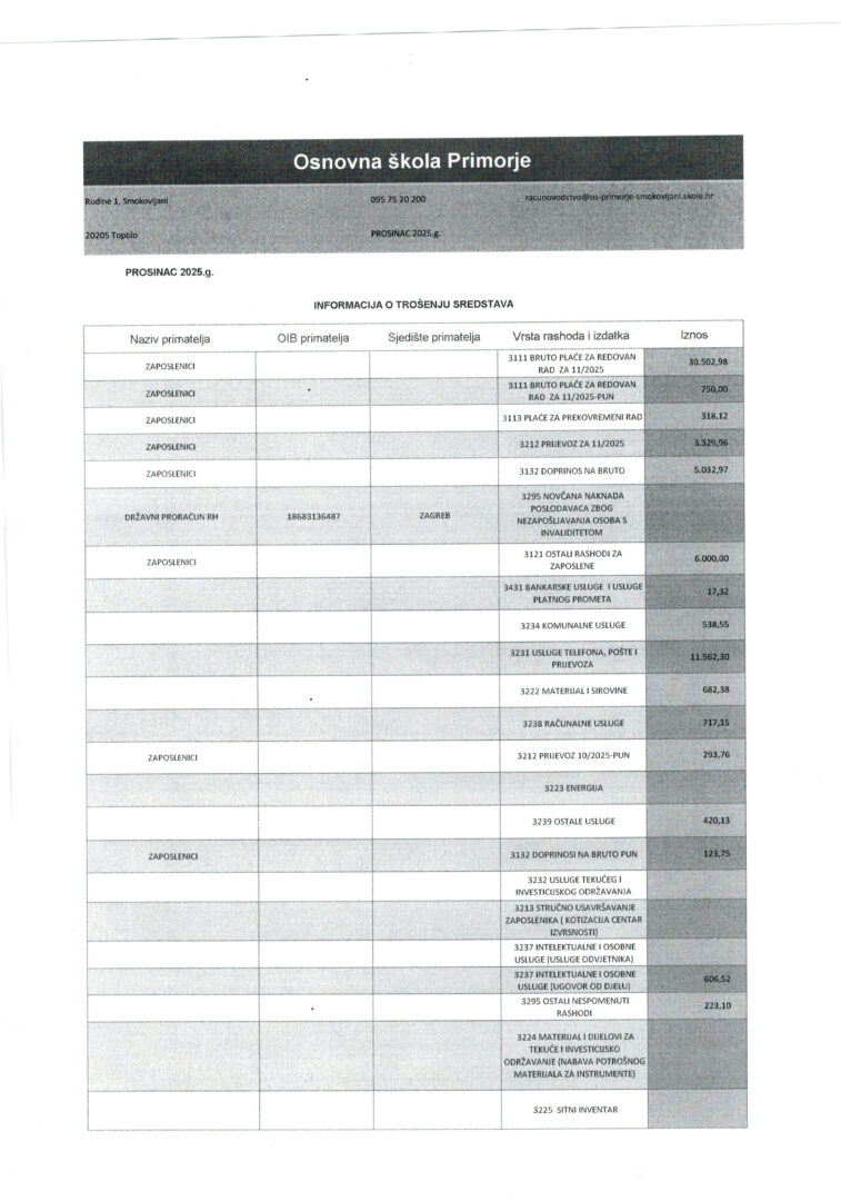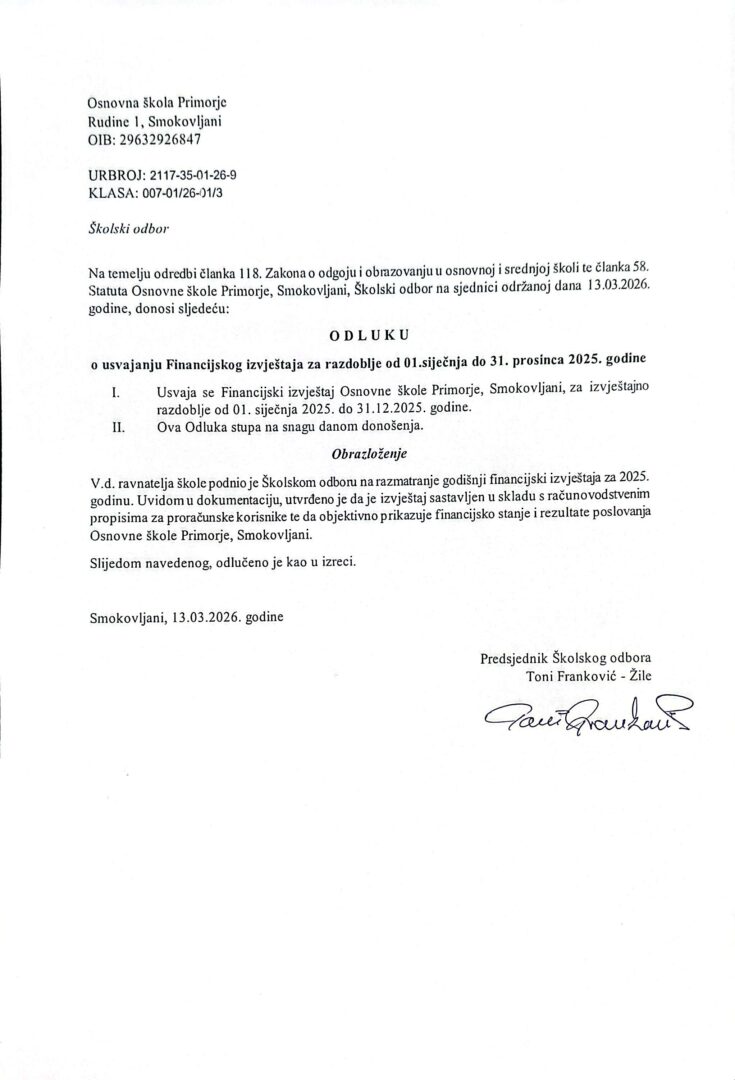 Financijska dokumentacija i javna nabava Financijska dokumentacija Financijska dokumentacija Items per page Loading File Last Modified Download Transparentnost-pregled isplata- ožujak-2026 tra 18, 2026 Download Financije 2025. tra 07, 2026 Download Informacije o trošenju sredstava veljača 2026. ožu 18, 2026 Download OS SMOKOVLJANI 31.12.2025-ISPRAVLJENI ožu 17, 2026 Download referentna OŠ Primorje02022026 ožu 17, 2026 Download Bilješke uz financijske izvještaje razine 31 za I - XII 2025 (2) ožu 17, 2026 Download Potvrda 23.02.2026. ožu 17, 2026 Download Potvrda (7) ožu 17, 2026 Download 1000051517 ožu 17, 2026 Download referentna OŠ Primorje02022026 velj 18, 2026 Download Showing 1 to 10 of 100 files Previous 1 2 3 4 5 6 ... 10 Next Javna nabava Javna nabava Items per page Loading File Last Modified Download Transparentnost informacija o trošenju sredstava (2) - 23.1.2026. sij 23, 2026 Download Transparentnosst informacija o trošenju sredstava (1) - 23.01.2026. sij 23, 2026 Download OBAVIJEST-o_odabiru_ponude_PJN lis 28, 2024 Download